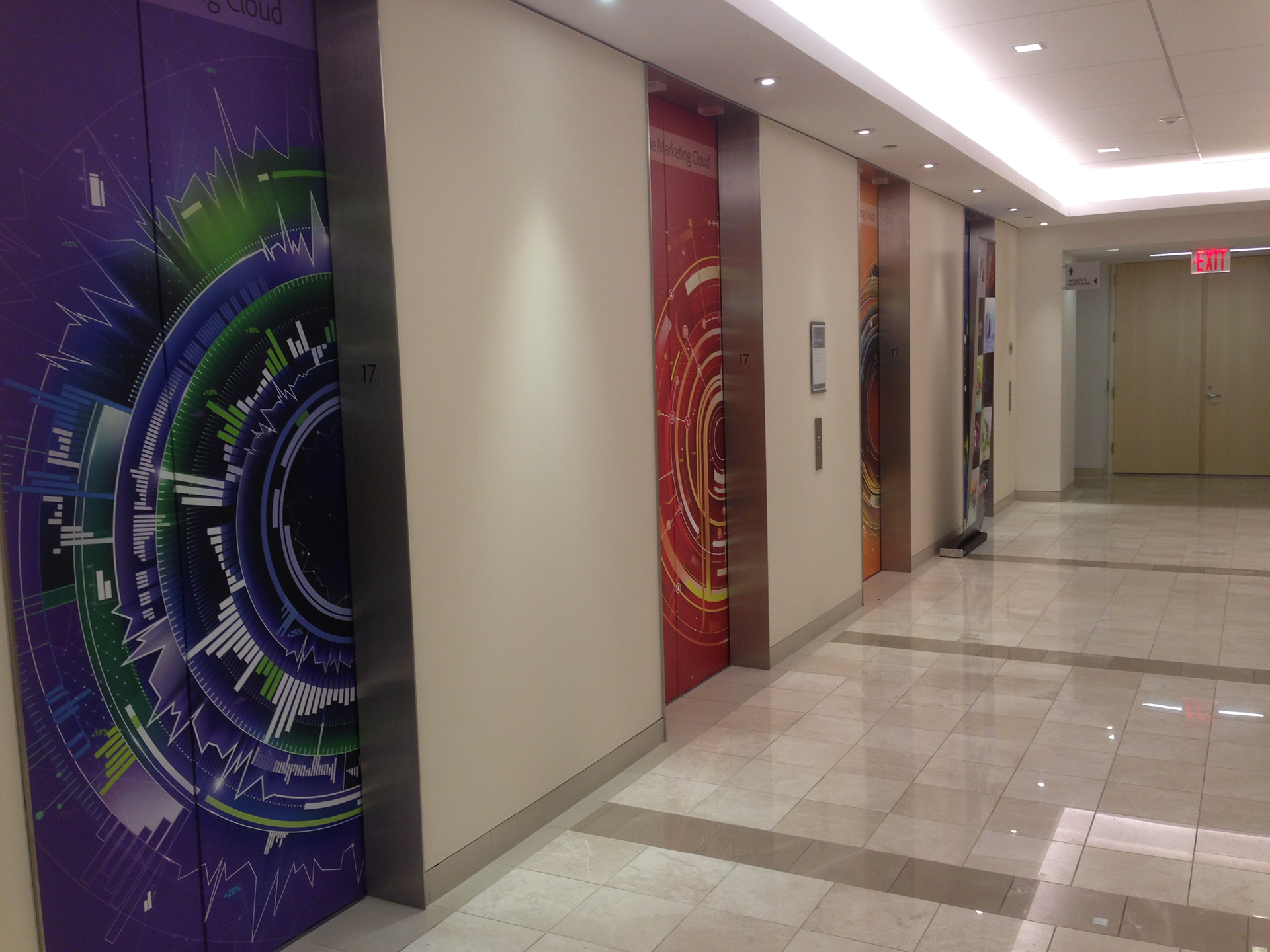 Adobe graphics and branding were applied to the elevator lobby. The building is full of different companies, so now when you arrive on the Adobe floor, you are welcomed with bold graphics!